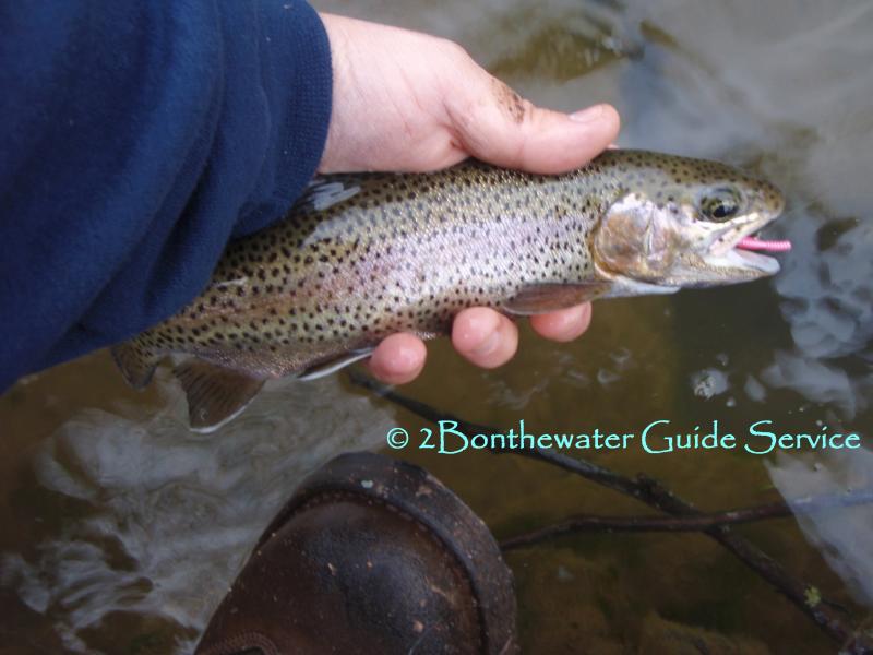 Spent about an hour today on a Class A water. Conditions were weird !! Snowing like crazy when I left the house, then the sun came out and melted it all away. All in about 30 minutes time. I managed 2 very nice wild browns on the pink worm. Water is still super cold and the fish are very lethargic. A few little black stoneflies in the air, but nothing like my last outing where they were dancing all over the water.