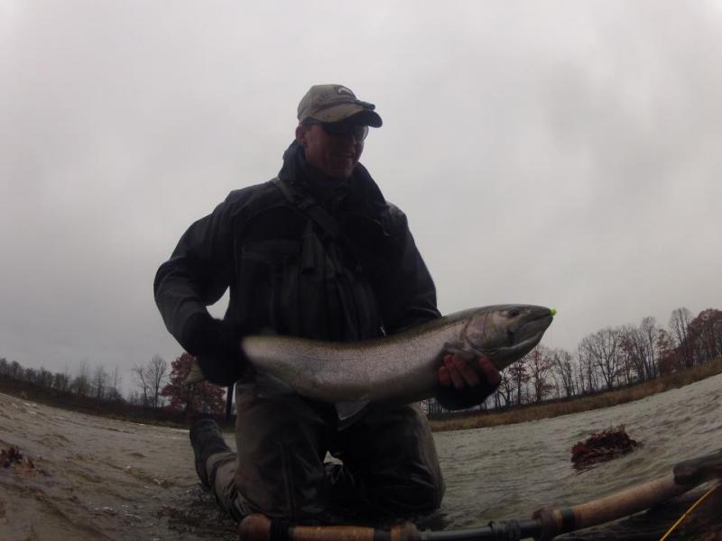 I was just emailed a pic from Mark. Mark is from NY and has been buying flies and testing flies for me over the past 2 years. He has a few videos on YouTube showing him landing some nice steel-- Steelhead Video His fish was a HOSS and was taken on a Crazy Spawn fly--tied with Bill Skilton's Micro Flash Egg Yarn (which you can barely find anywhere) and on a VMC size 10 RED walleye/Salmon/Steelhead Octopus hook. Mark said it was in the mid-teens and is one of the few fish he had to chase in order to land. Awesome job Mark---that is one impressive steelhead !!! Six-pound tippet !!!!!