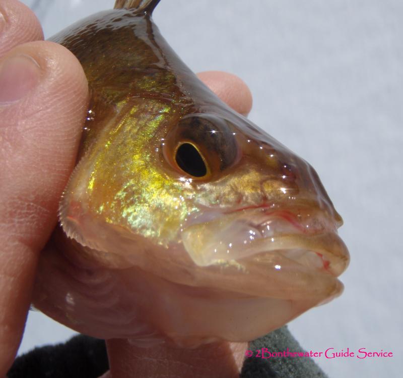 Headed over to Antietam and fished from 10am to about 1pm. The ice was skinnier than I had expected it to be. Most of the holes that were drilled had an ice thickness that ranged from 3 to 3.5 inches. Plenty of folks out on the ice. There were a good number of shelters on the ice. I fished a pair of holes where a shelter was and whoever was in the shelter was so kind as to leave a huge pile of cigarette butts covered up with ice. Flat out disgusting. Take that stuff with you, it does not belong in the environment. I managed a good number of Yellow Perch, one Rainbow Trout to the top of the hole and one Largemouth Bass to the top of the hole. I moved around a good bit. No Bluegills or Crappie. Please be careful. No ice is safe !!! Know where to get on the lake and where to get off the lake. Not sure when I'll be out again, but if we get the predicted warm weather or some rain, ice fishing might get put on hold. Certainly more ice already this year than last year !!! Be safe and Live to be On The Water. Check out the serrated edge on the operculum.