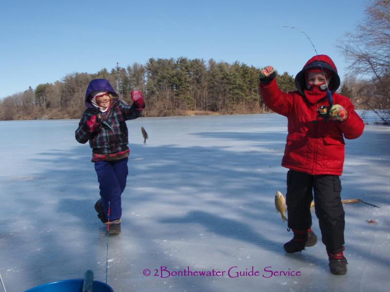 Took the rugrats out to do some ice fishing. About 27 degrees when we headed out the door. Our first stop was to get some snacks: chips, beef jerky and vitamin water. Off to the lake. Well, the first place we stopped at was a bust. Second spot was very good with 5 inches of ice. Both kids were into panfish nearly immediately. We didn't stay long--the wind was making it very cold. But, they fished for about an hour with minimal complaints. Vin landed the biggest fish of the day, which was a largemouth bass. The day ended with a double.